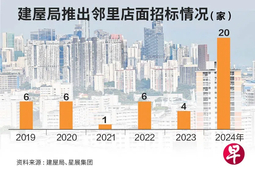 在2024年,建屋发展局(HDB)共推出20家邻里店面以供招标,这一数量是自2019年以来的三倍多。2019年、2020年和2022年推出招标的邻里店面各为六家,2021年仅推出一家,2023年则推出四家。星展集团(DBS)日前发布的一份报告指出,创纪录的招标数量部分是由于之前的运营商,例如巨人超市(Giant)和好超市(HAO mart)精简业务的过程中放弃了部分店面。