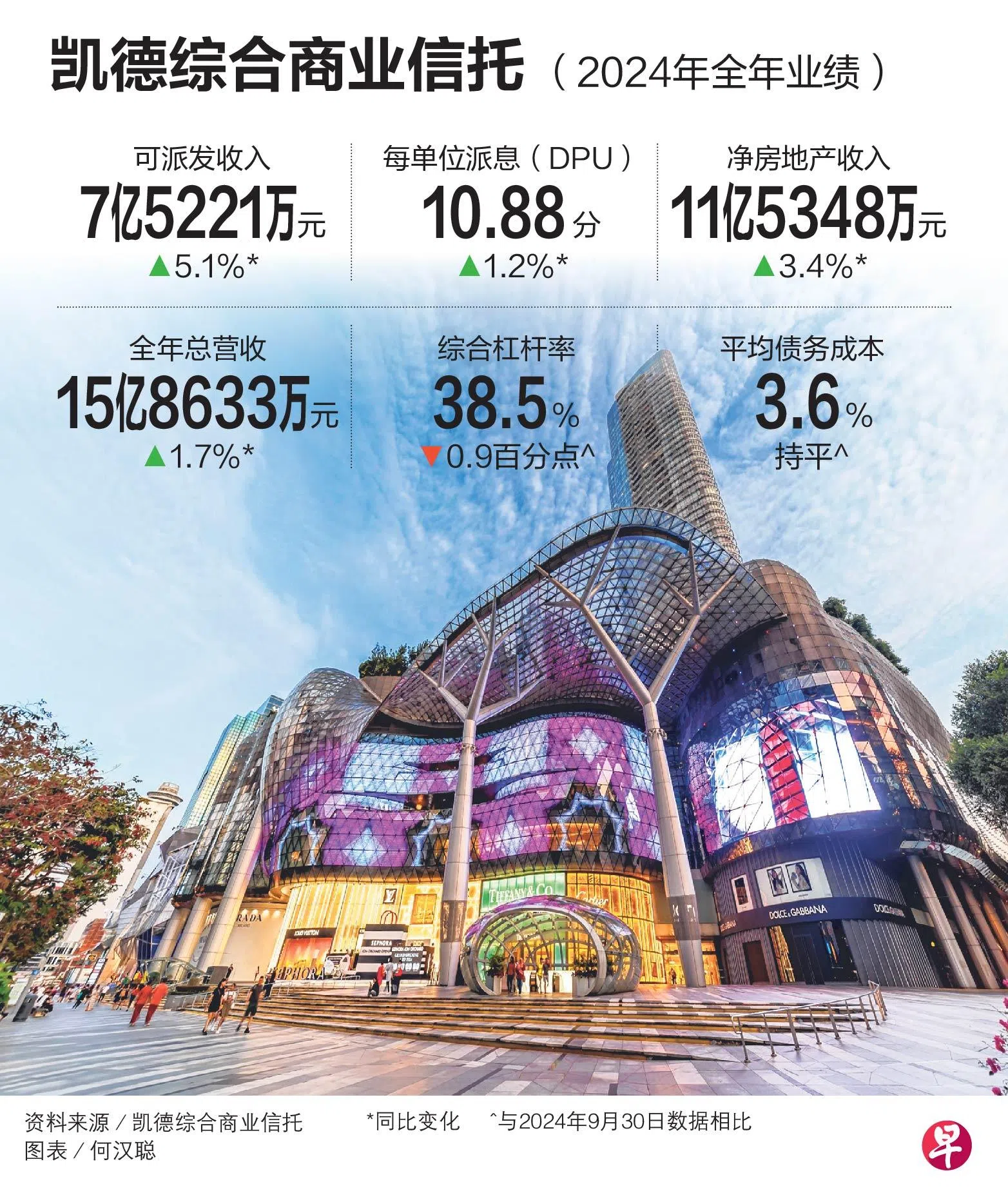 凯德综合商业信托(CapitaLand Integrated Commercial Trust)2024财年下半年的每单位派息(DPU)为5.45分,这使得2024财年每单位派息为10.88分,同比增长1.2%。