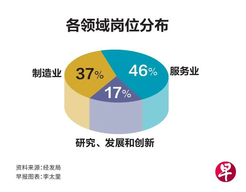 这些岗位中,46%在服务业,37%在制造业,其余17%在研发和创新领域。大多数岗位将是专业人员、经理、行政人员和技术员。