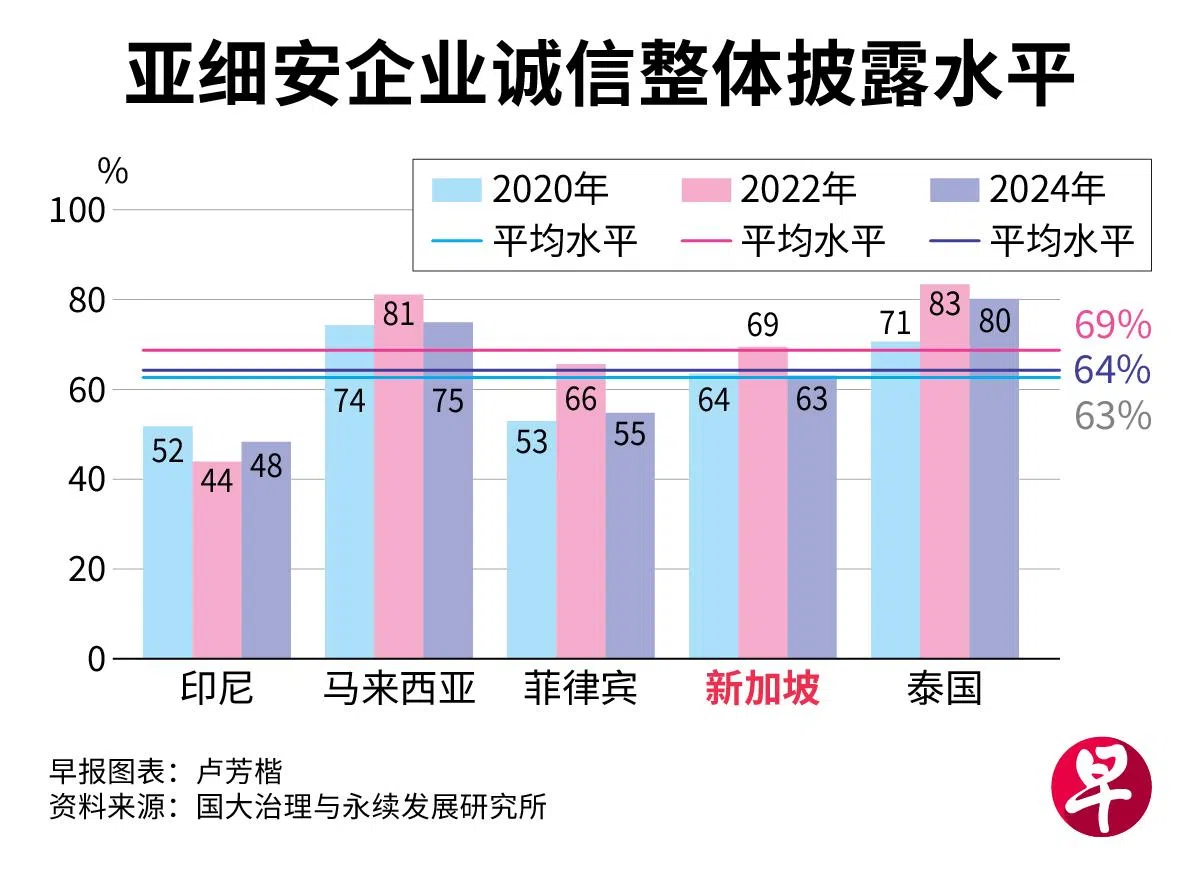 新加坡国立大学商学院的治理与永续发展研究所(CGS)星期一(2月10日)发布最新的《2024年亚细安企业诚信披露报告》(Corporate Disclosure on Business Integrity in ASEAN 2024)显示,亚细安的250家受评估企业平均披露得分从2022年的69%,在2024年下降至64%。