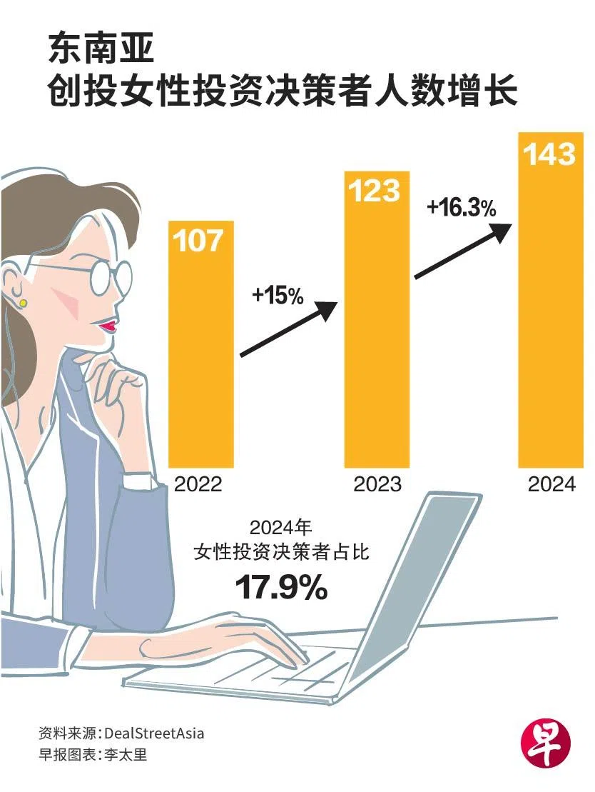 创业资本媒体公司DealStreetAsia的研究发现,东南亚风险创投公司所有投资决策者当中,只有17.9%是女性,比前一年略高0.5个百分点。