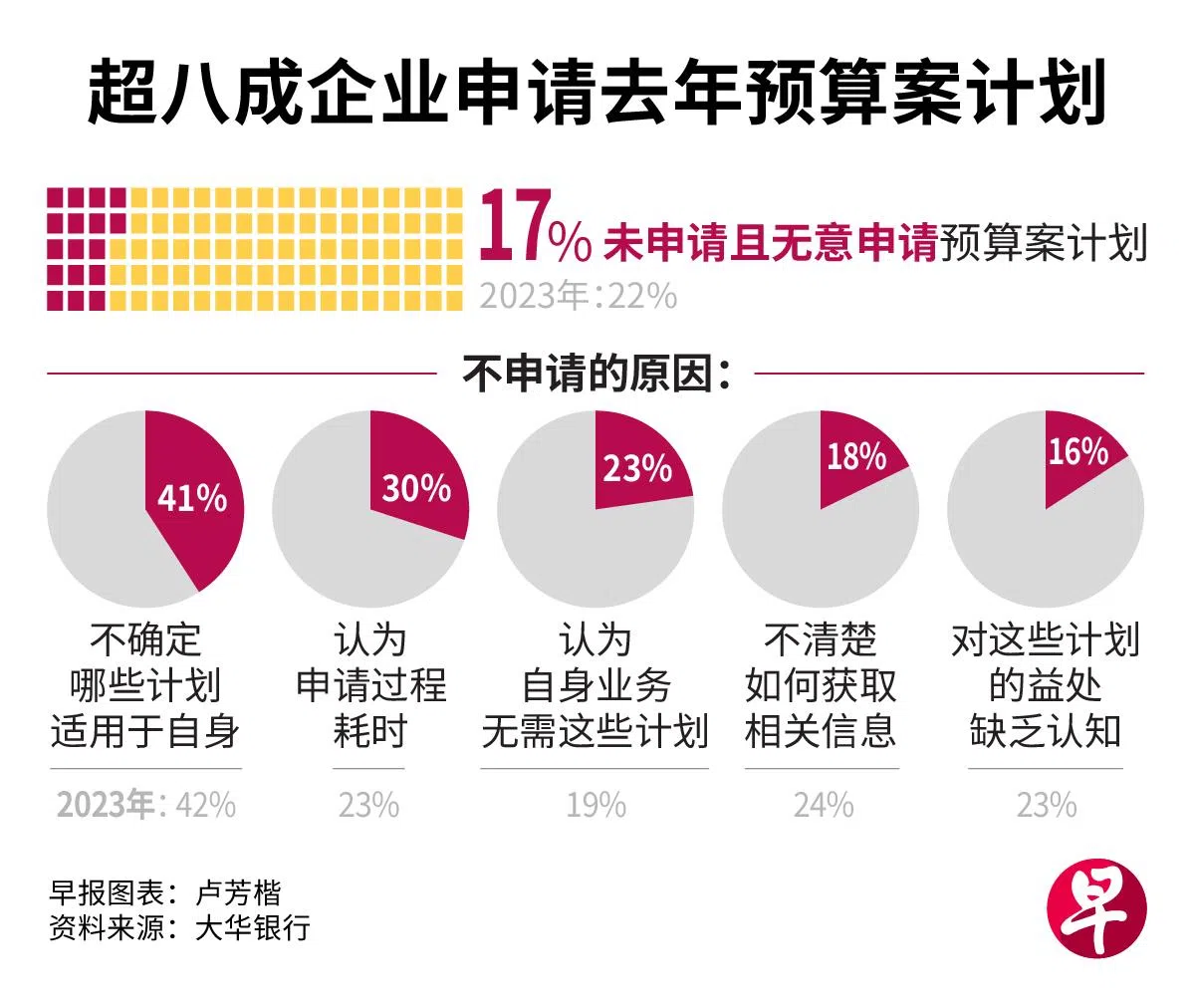 一项调查显示,83%的新加坡企业已申请或希望申请2024年财政预算案中宣布的计划,比2023年高出五个百分点。其余17%尚未申请任何计划且无意申请。