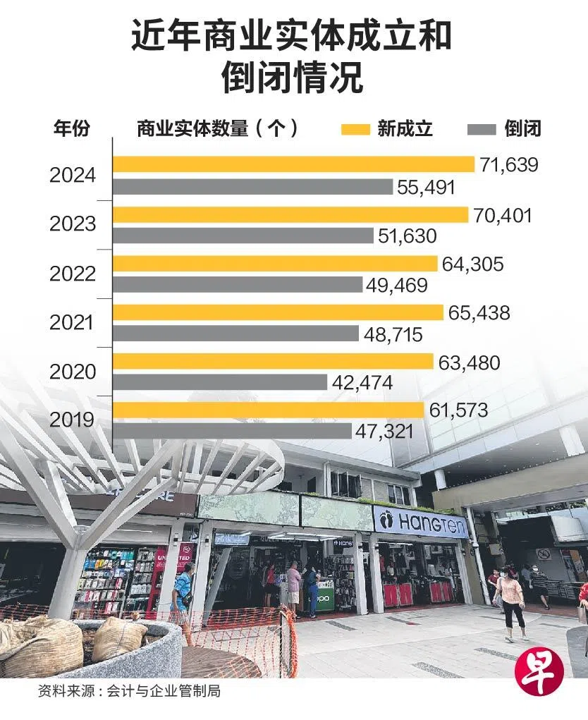 另一方面,倒闭的商业实体有5万5491个,比2023年同期的5万1630个,增加7.48%,增幅高于前一年的4.37%。商业实体涵盖独资企业、合伙企业、有限责任合伙企业、本地和外国公司等。