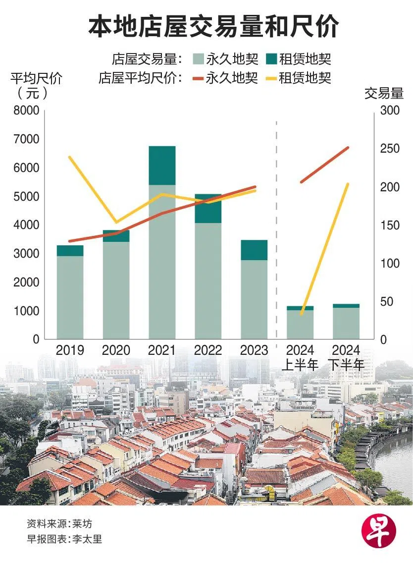 莱坊报告指出,永久地契店屋依旧是投资者和买家首选,下半年的47宗交易中,41间店屋便属于永久地契,比上半年的38间来得多。由于交易增加,这类店屋下半年的平均售价增长21.5%,尺价从上半年的5522元上涨至6708元。