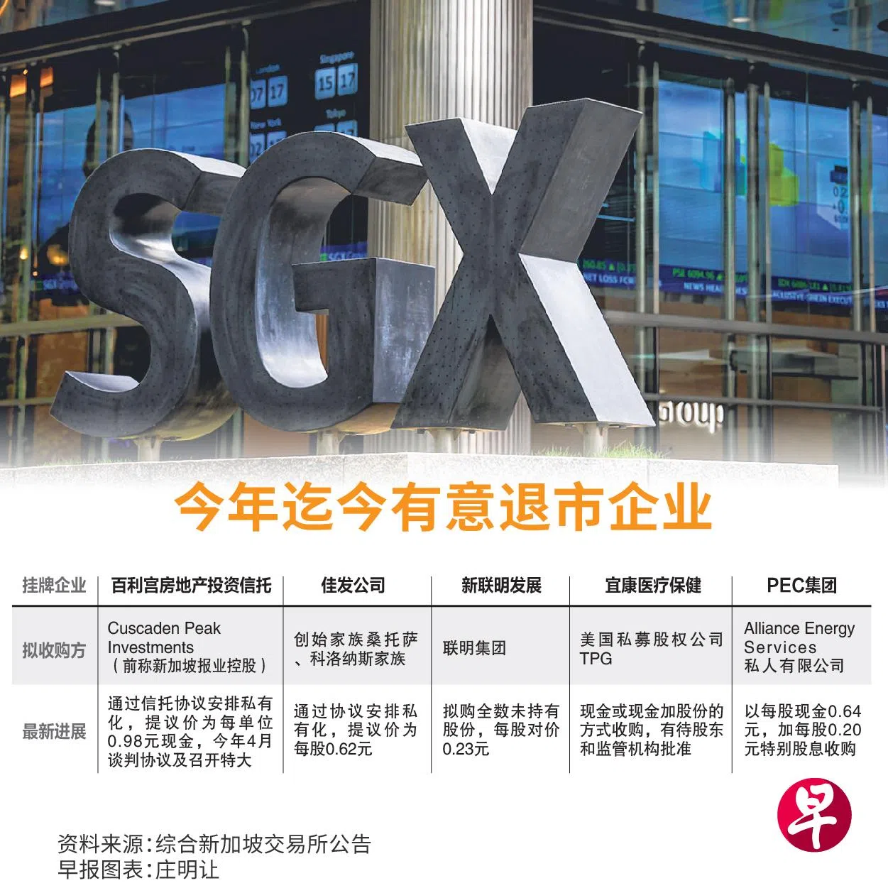 今年迄今,新加坡交易所已经传出五家上市企业可能私有化的消息。它们分别是百利宫房地产投资信托(Paragon REIT)、佳发公司(Japfa)、新联明发展(SLB Development)、宜康医疗保健(ECON Healthcare),以及PEC集团。