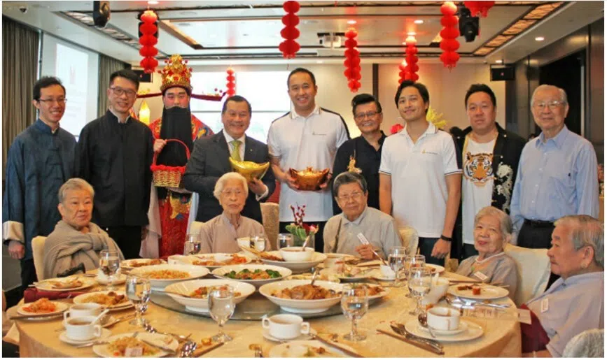 丰隆基金在2018年1月,为敬老院的长者们举行新年午餐活动,郭益智(后排左五)和郭益升(后排右三)参加。(取自丰隆基金官网)