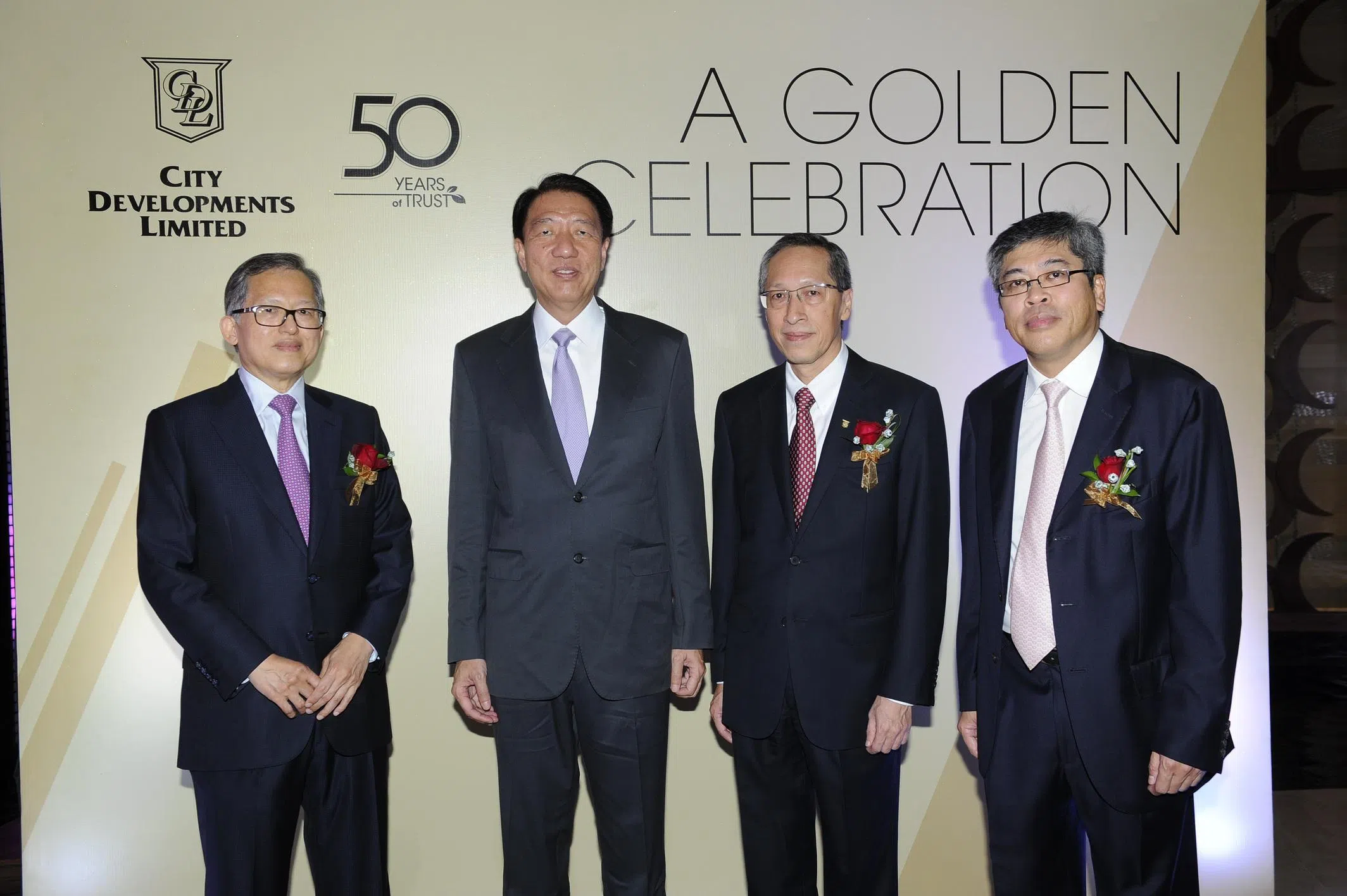 郭令明的已故弟弟郭令裕曾是城市发展的副主席,2015年11月突发心脏病去世,仅62岁。这是城市发展50周年庆典时的照片。左起分别是郭令明,当天的主宾、时任副总理张志贤,郭令裕,以及郭令明的堂弟郭令柏,时任城市发展董事。