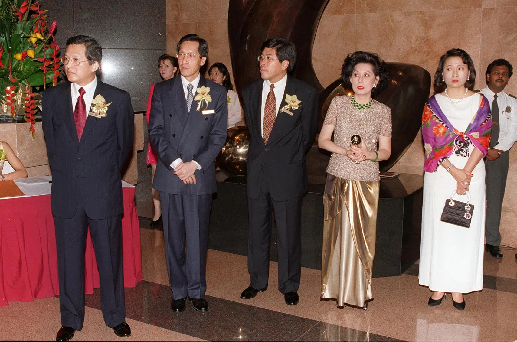 1998年1月18日,共和大厦正式开幕仪式上,郭令明(左一)、已故弟弟郭令裕(左二)、堂弟郭令柏(中)、郭令明妻子郭佩玲(右二),以及郭令裕妻子合影。(档案照片)