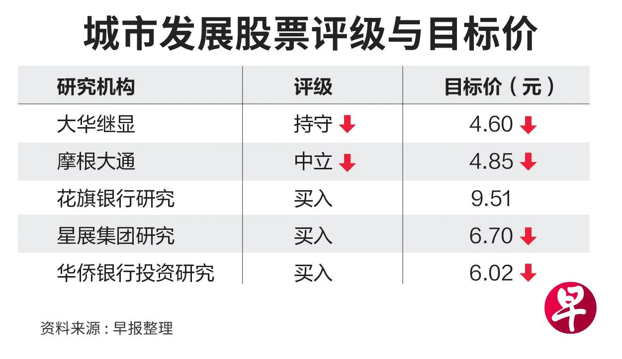 大华继显星期四(27日)将城市发展的评级降为持守,目标价从7元调低到4.60元;摩根大通则把评级降为中立,目标价从6.05元调低到4.85元。摩根士丹利(Morgan Stanley)继续给予“减磅”(underweight)评级,目标价维持在5元。