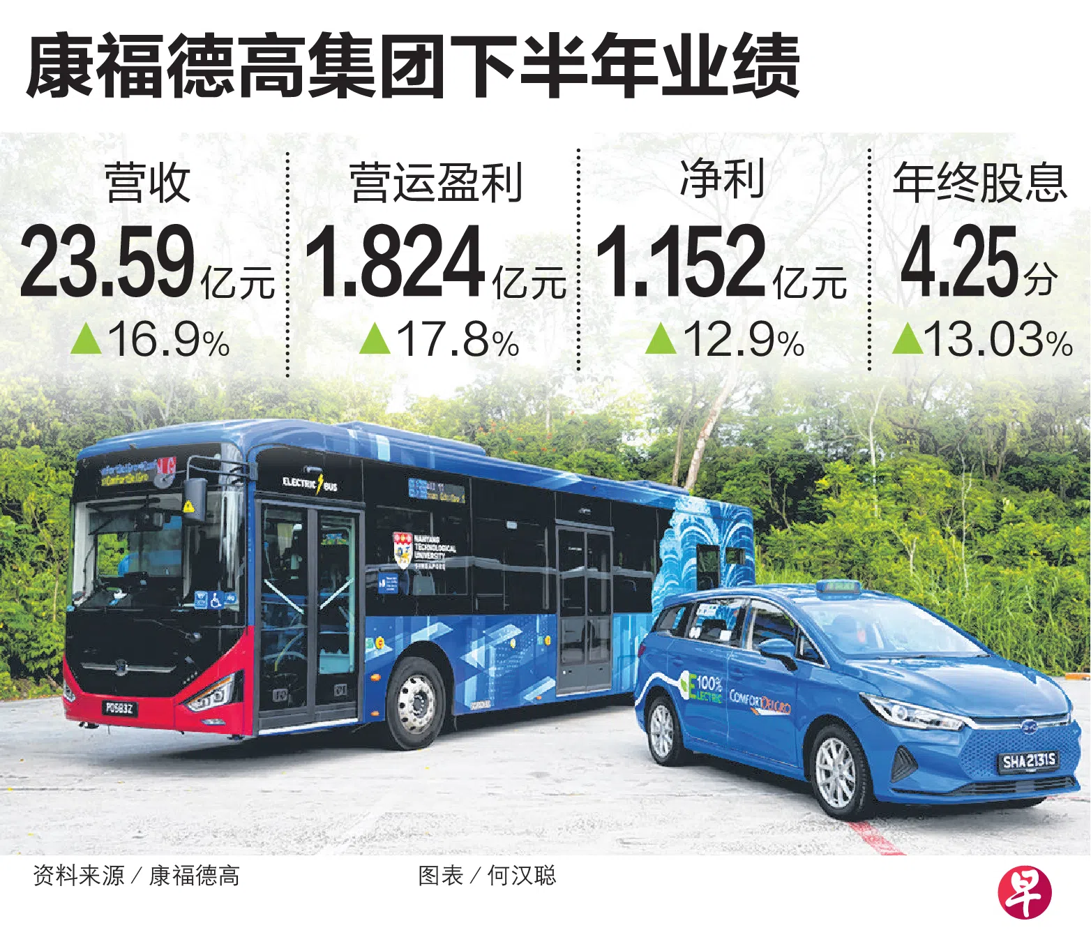 康福德高(ComfortDelGro)星期四(2月27日)闭市后发布的业绩显示,集团的公共交通业务在下半年营收同比增加3.1%至15亿9100万元,主要由于英国公共巴士合同收入增加、铁路客流量增加及车资上涨,以及公共巴士合同的指数化车资调整。这个业务下半年营运盈利同比增加10.3%至7500万元。