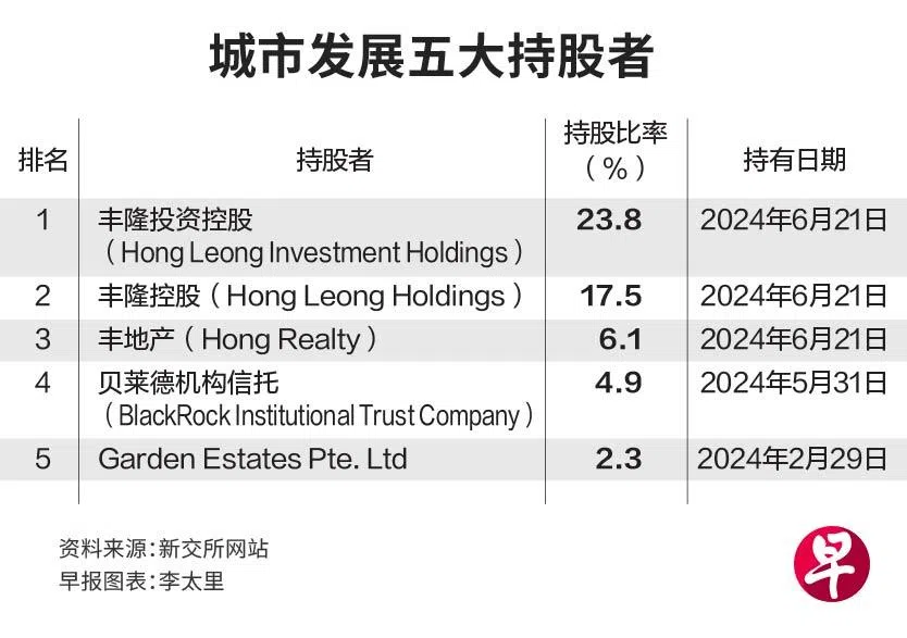 新加坡交易所网站显示,城市发展持股最大的是丰隆投资控股(Hong Leong Investment Holdings),拥有23.8%股权,其次为丰隆控股(Hong Leong Holdings),拥有17.5%。丰隆投资控股和丰隆控股是由郭氏家族成员掌控的私人公司,包括郭令明的堂兄郭令灿也持有部分股权,但家族成员股权比率未披露。
