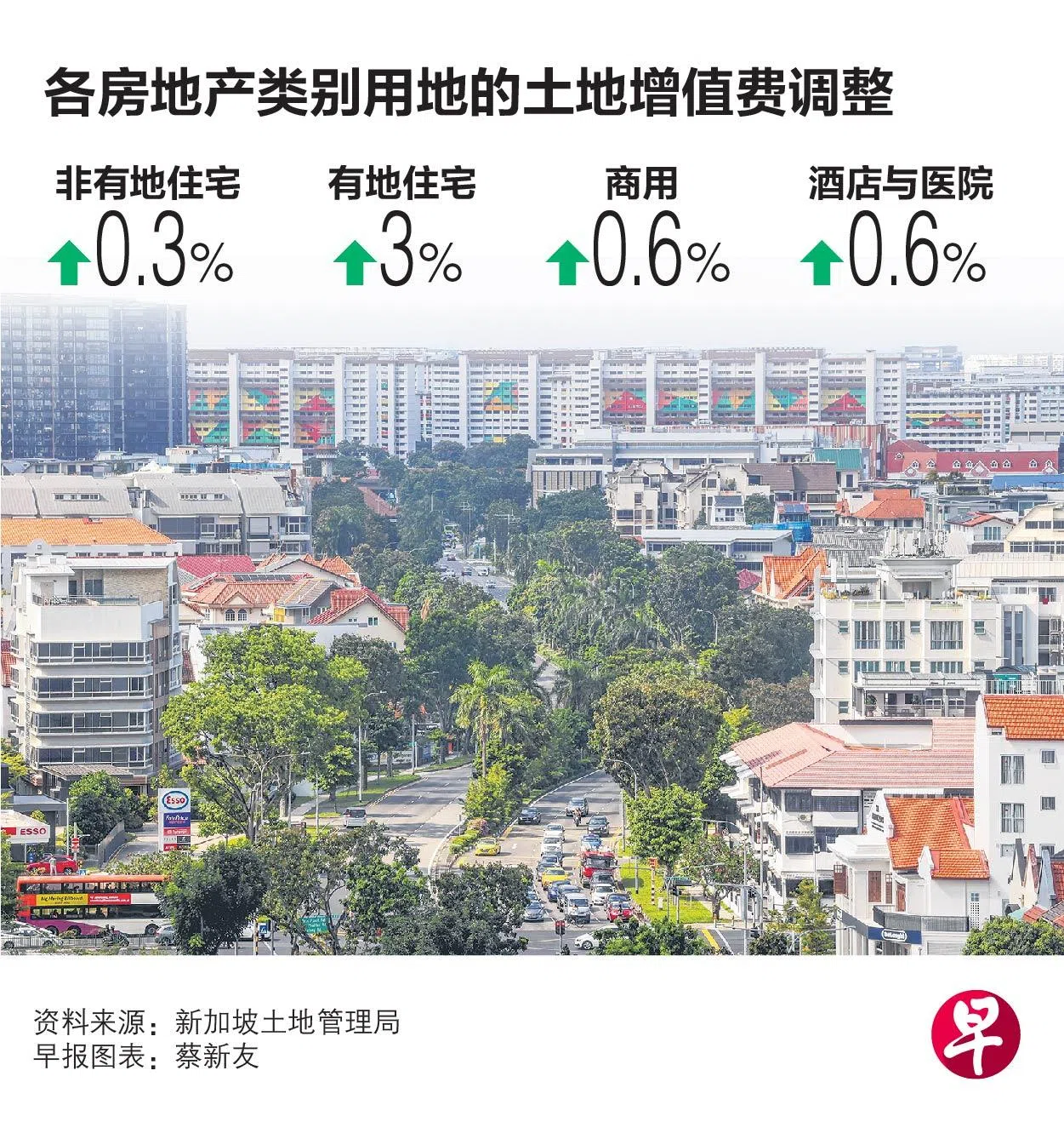 这次所有房地产类别的土地增值费都上升。其中,有地住宅用地的土地增值费平均上调3%,所有118个区的增值费都增加,涨幅介于3%至4%。