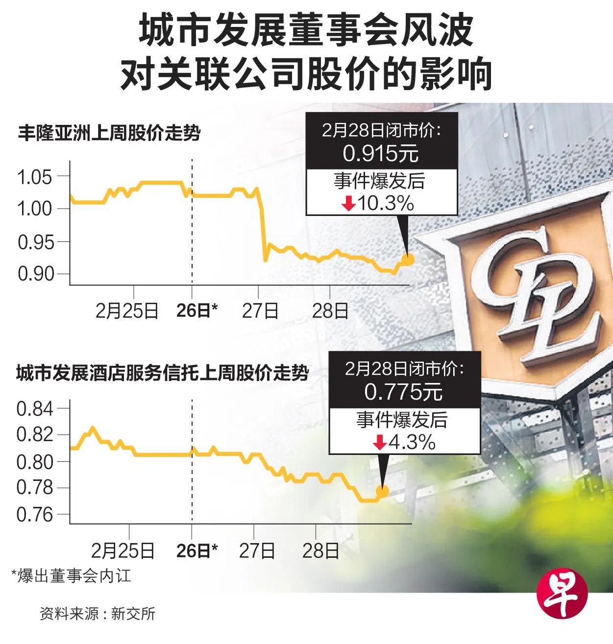 与此同时,另一家关联公司城市发展酒店服务信托(CDL Hospitality Trusts)的股价,也从上个星期二(2月25日)的闭市0.81元,下跌至上个星期五收报0.775元,自事件曝光后跌了4.3%。