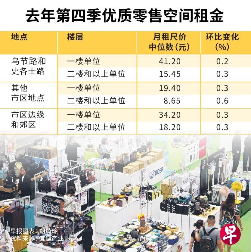房地产咨询公司宜迪产业咨询公司(ETC)的第四季零售租金报告显示,乌节路和史各士路的优质商场一楼月租尺价中位数在强劲需求的推动下,环比增长0.2%至每平方英尺41.20元。较高楼层的店面,月租尺价中位数则增长0.3%至15.45元。