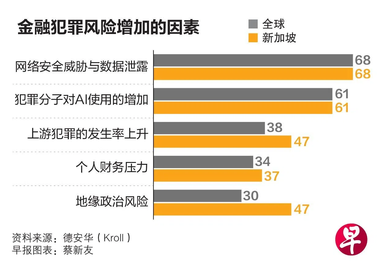 报告称,金融犯罪风险增加的诱因来自多方面。新加坡受访者认为,网络安全威胁与数据泄露(68%)和犯罪分子对AI使用的增加(61%)是主要因素。