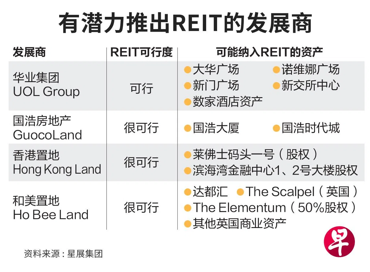 陈伟祥认为,华业集团(UOL Group)是有潜力设立房地产投资信托的发展商之一,国浩房地产(GuocoLand)、香港置地(Hong Kong Land)以及和美置地(Ho Bee Land)推出REIT或重组成合订证券的可行度更高。