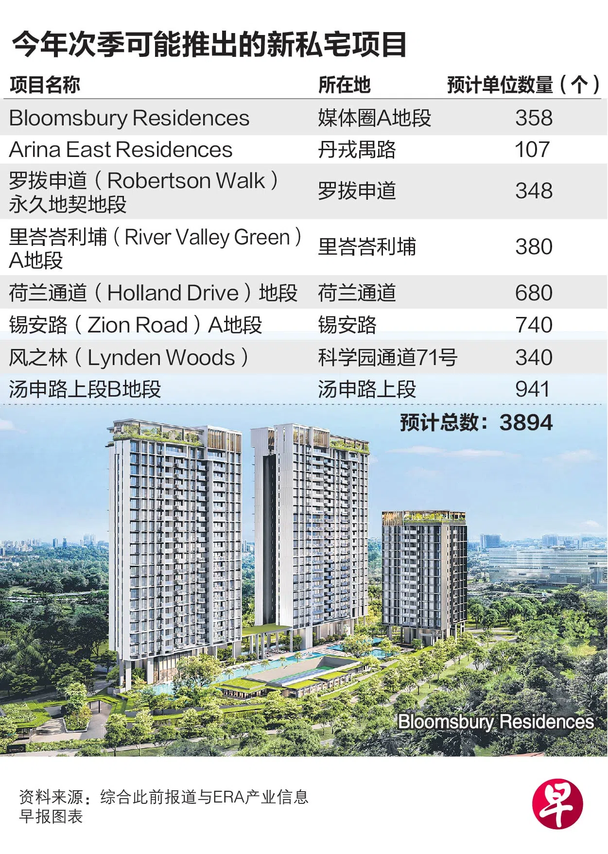其他可能在第二季推出的项目还包括:位于媒体圈A地段、将在4月正式开卖的Bloomsbury Residences;位于丹戎禺路(Tanjong Rhu Road)的Arina East Residences;以及汤申路上段B地段的发展项目。它们分别可建358个单位、107个单位以及941个单位。