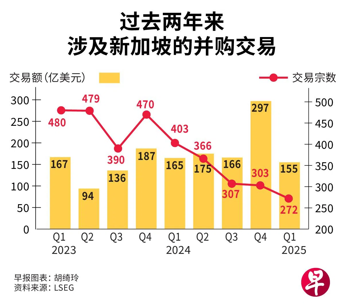 根据市场分析公司LSEG的数据,去年第四季涉及新加坡的并购交易额创下两年来新高,达297亿美元(398亿新元),今年第一季则达155亿美元。