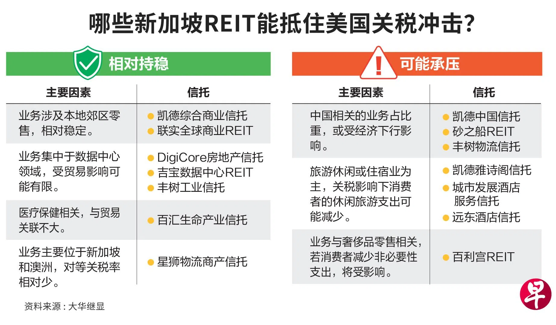 但报告也提醒,由于中国经济或因对等关税再次承压,若后续对其国内制造业乃至消费都产生负面连锁反应,业务主攻中国市场的信托将受影响。例如,凯德中国信托、在中国经营奥特莱斯商场的砂之船REIT,以及管理资产部分位于中国的丰树物流信托。