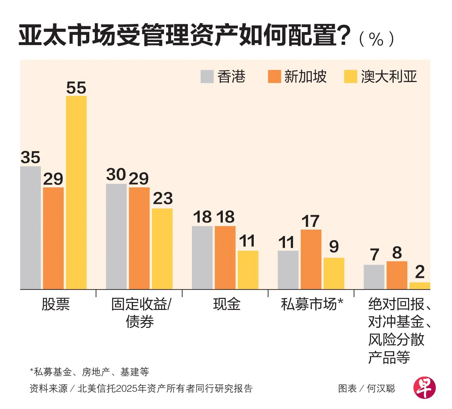 北美信托(Northern Trust)发布的2025年全球资产所有者同行研究报告显示,在本地的受管理资产中,29%配置于股票、固定收益及债券。
