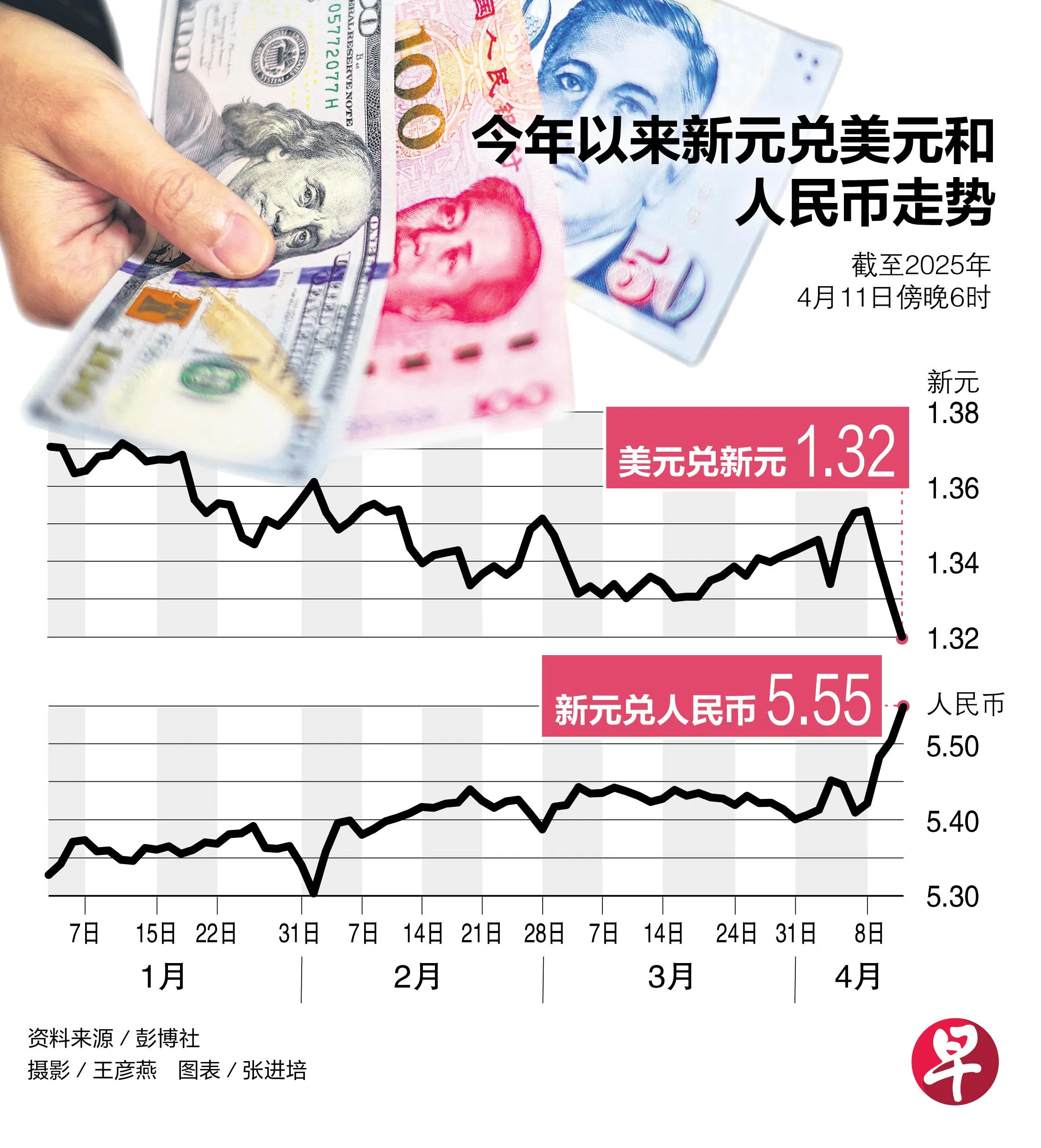 过去一周投资者撤资美国资产,美元节节下滑,美元兑新元汇率星期五(4月11日)下午一度触及1.3157的低点,为去年11月5日来的最低。过去五天新元升值了2%。