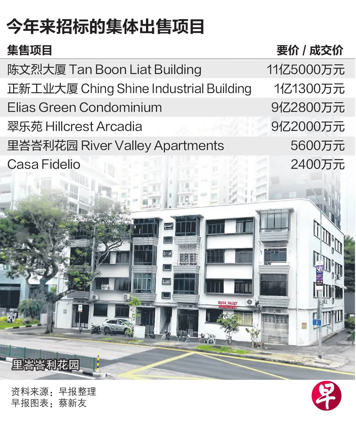 截至4月6日,今年来有六个集体出售项目推出,其中的里峇峇利花园(River Valley Apartments)和正新工业大厦(Ching Shine Industrial Building)售出,显示市场仍然疲弱。