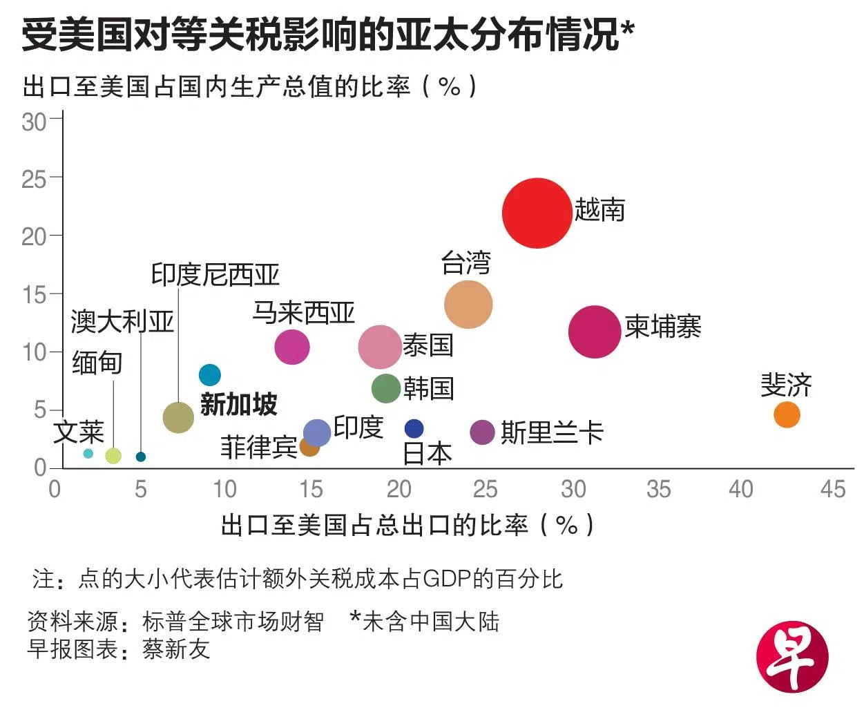 东方汇理财富管理亚洲首席策略师陈达德受访时建议,从新加坡直接出口到美国的企业,应寻找其他国家的客户,转向这些国家的国内消费市场。同时,与其美国客户沟通,探讨如何共同承担或传导因关税上涨而产生的成本增加。