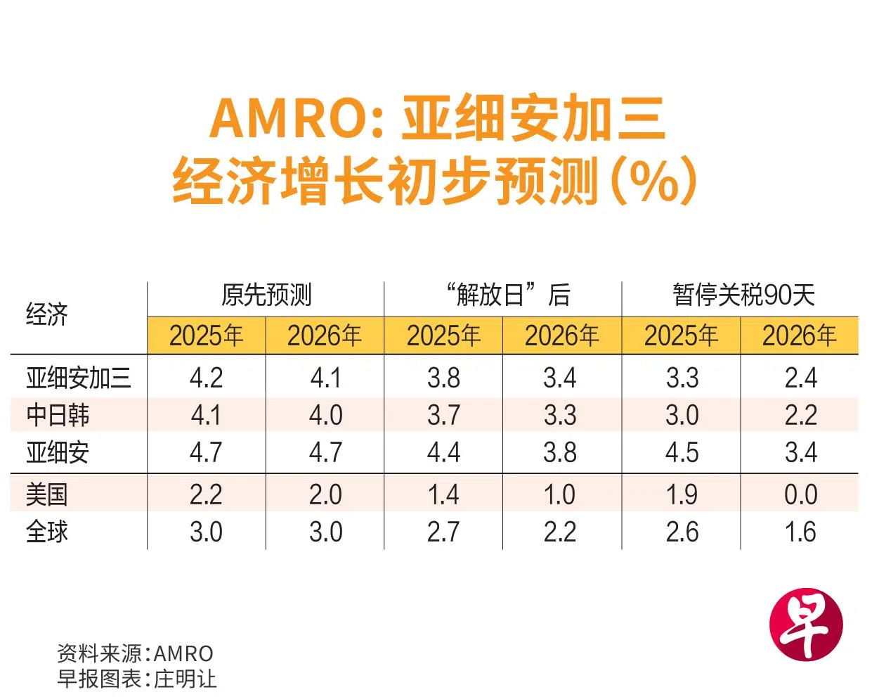 但在美国政府4月2日宣布加征对等关税后,AMRO最新报告预计,这一区域增长率可能在今年跌破4%至3.8%,并在明年进一步放缓至3.4%。