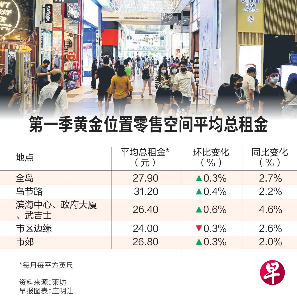 根据莱坊(Knight Frank)最近发布的2025年第一季零售报告,全岛黄金位置的零售平均租金环比增长0.3%,同比增长2.7%,达到每月每平方英尺27.90元。