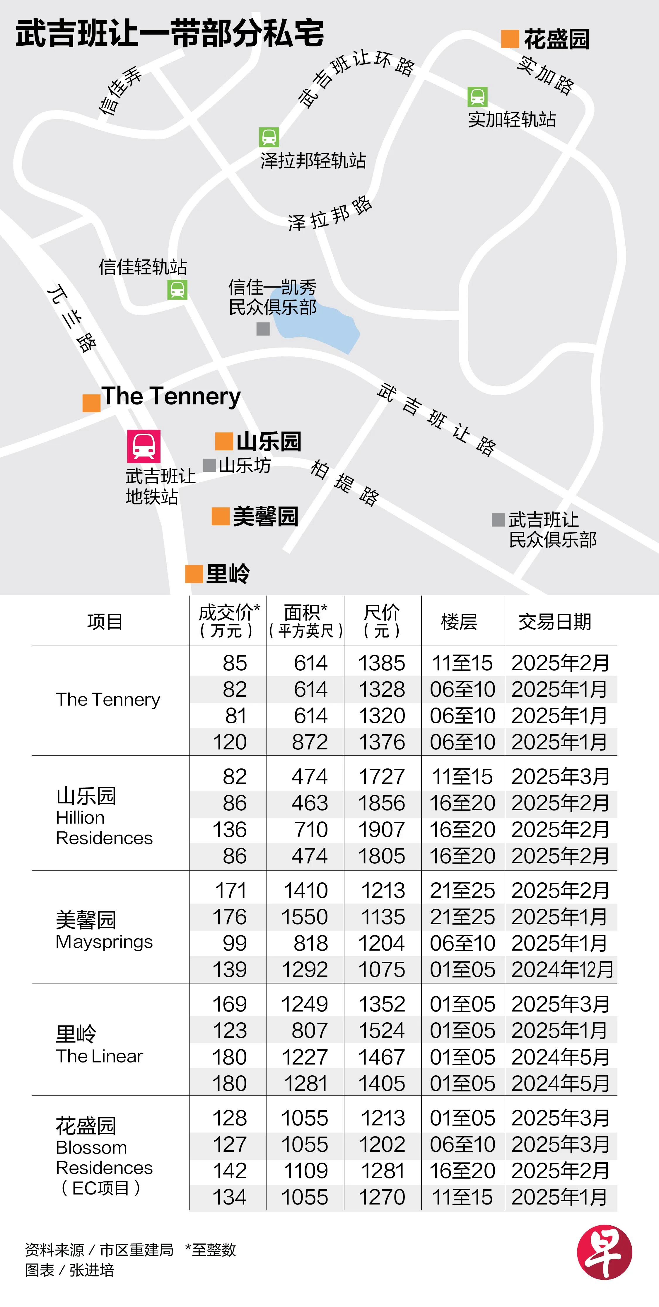 这个地铁站周边有多个非有地私宅项目,属于中央区以外(OCR)的大众私宅,单位面积较大,屋龄多在10至20年之间。2025年首季,这些项目的转售交易活跃,最近四宗交易都在前三个月内完成。