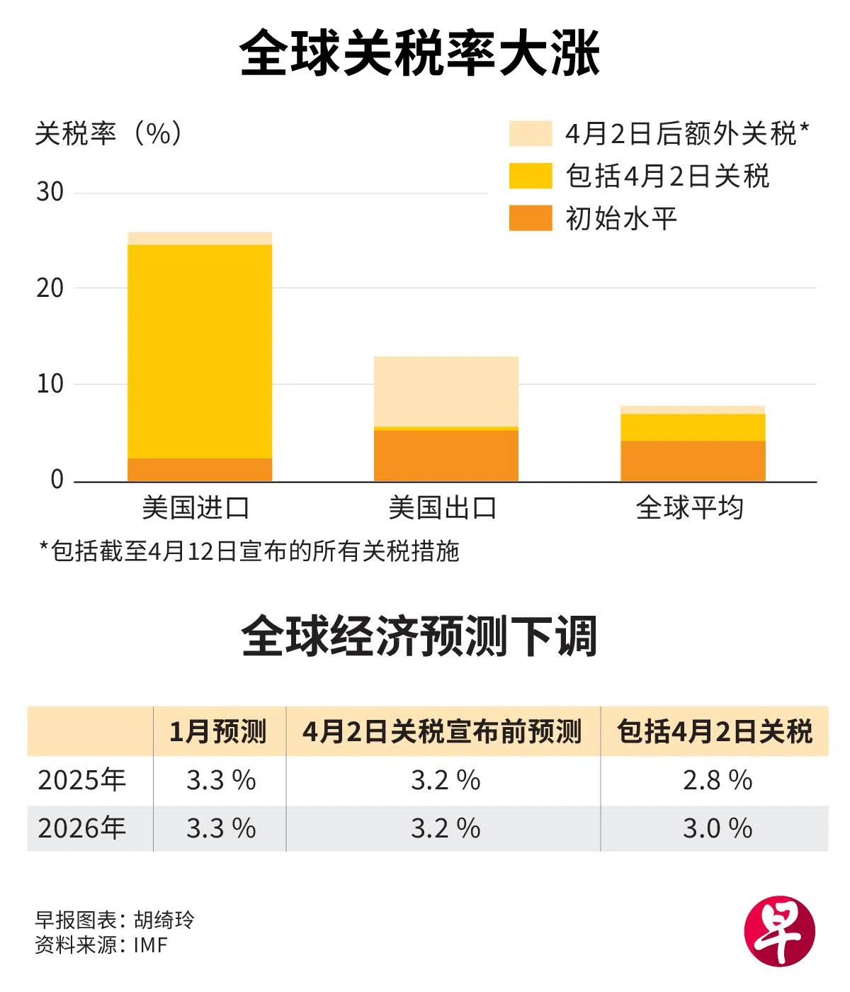 关税大战导致全球经济体系被打破,国际货币基金组织(IMF)将今年和明年全球经济增长预测,分别调低到2.8%和3%,比1月份预测分别低了0.5和0.3个百分点,但仍远高于衰退水平。