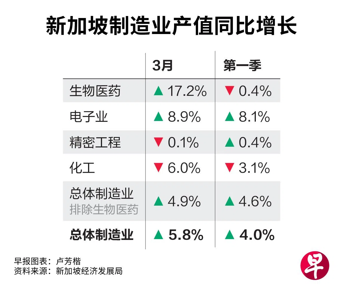 新加坡3月份制造业产值同比增长5.8%,连续九个月保持增势,不过仍远低于经济师此前预测的8.1%增幅。