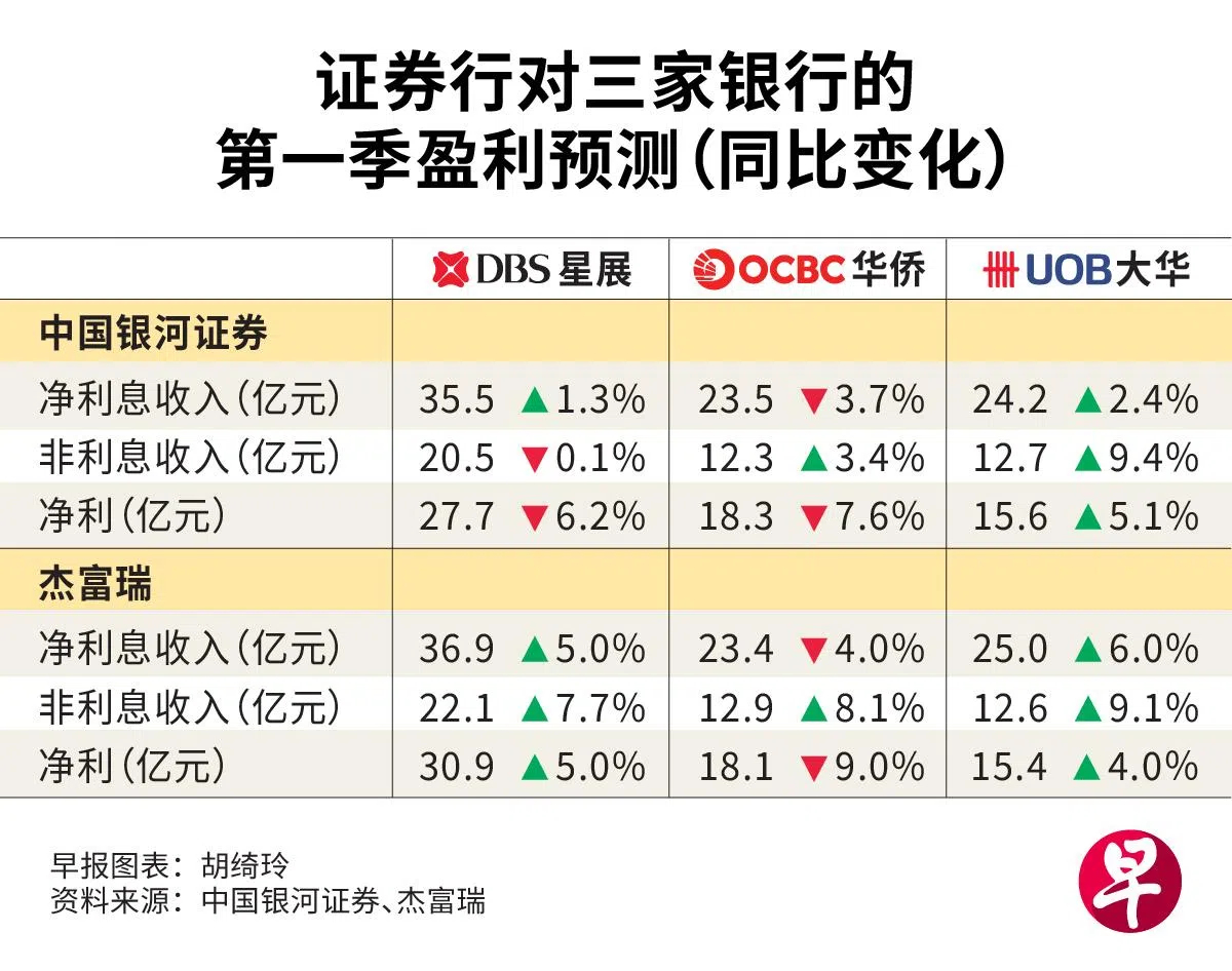 星展集团研究分析师林瑞雯持有大致相同的看法。她受访时指出,与去年第四季相比,本地银行第一季净利估计持平或下滑,主要是因为净利息收益率(NIM)环比下降,导致净利息收入减少。
