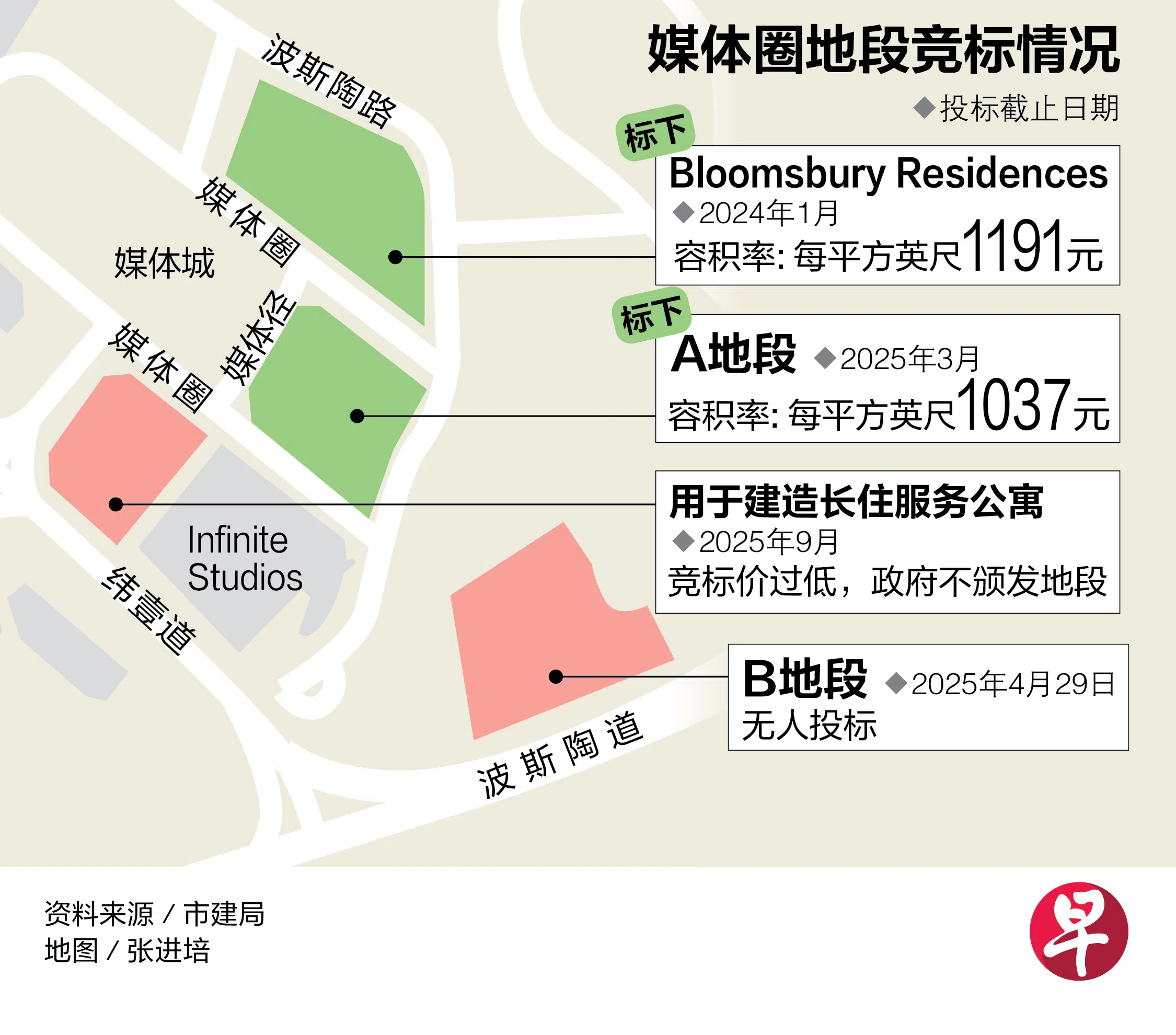 媒体圈一带的地段一直无法引起市场强烈兴趣。去年10月,区内的本地首个完全用于建造长住服务公寓(long-stay serviced apartment)的地段,因为竞标价过低,政府因此决定不颁发地段。以星狮地产(Frasers Property)为首的财团是唯一的投标者,出价1亿2000万元,相当于容积率每平方英尺461元,远低于市场预期的尺价650元至1100元。