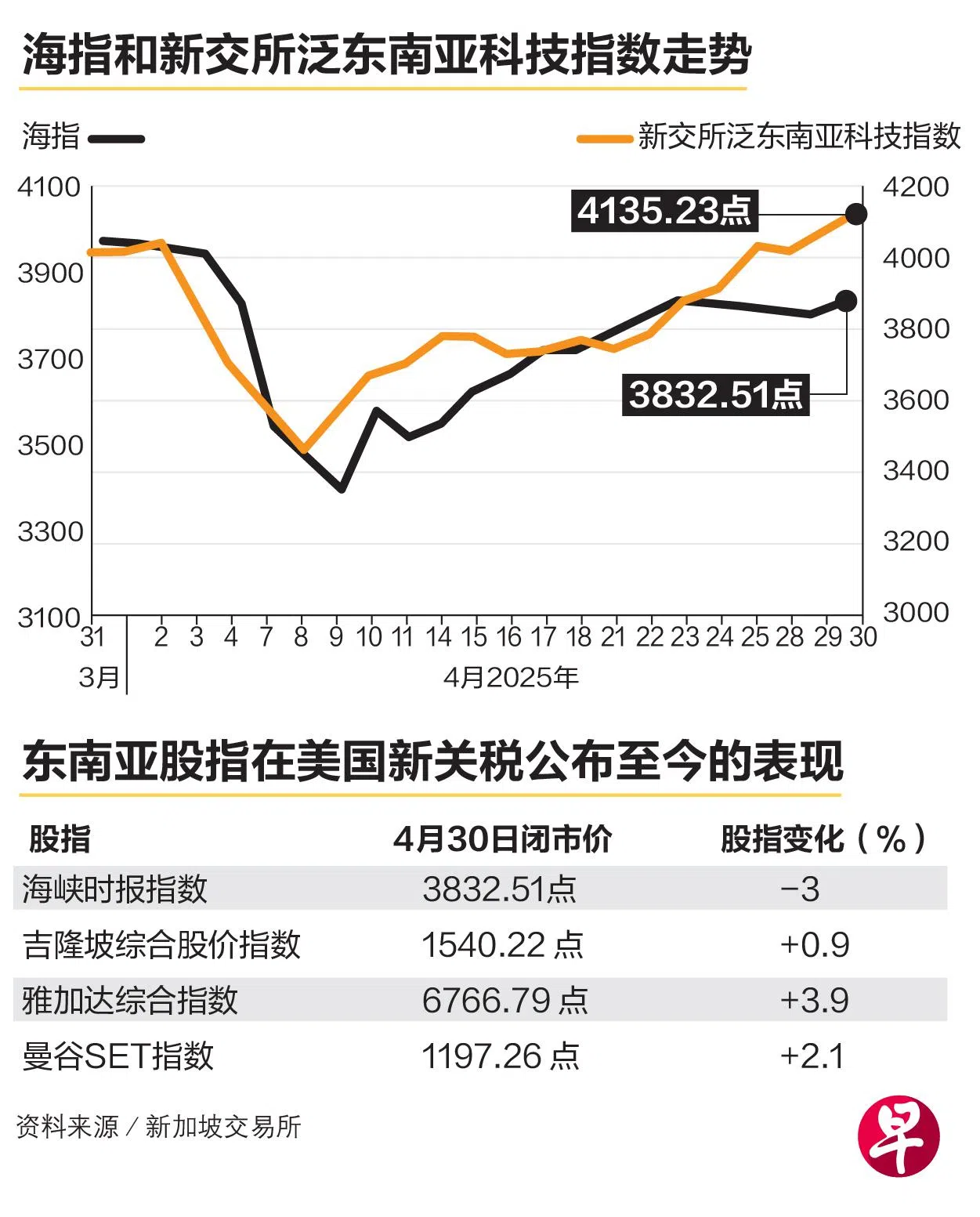 新加坡交易所提供给《联合早报》的数据显示,海峡时报指数自3月底至4月9日的短短数天内下跌了15%至3393.69点,之后逐步回涨13%至30日的3832.51点。