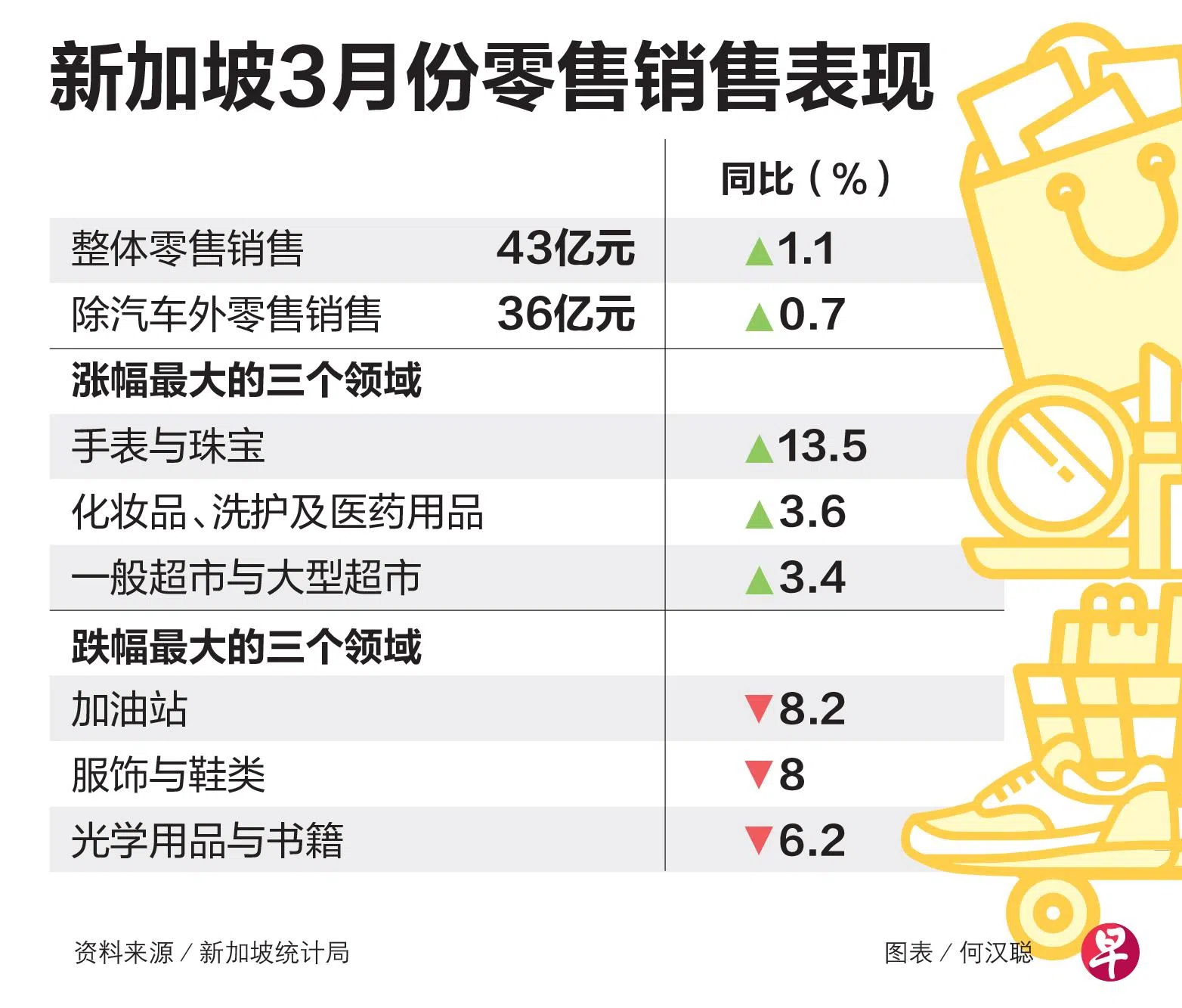 新加坡统计局星期一(5月5日)发布的最新零售销售数据显示,若不包括汽车销售,3月份的零售销售额则同比增长0.7%,报36亿元。