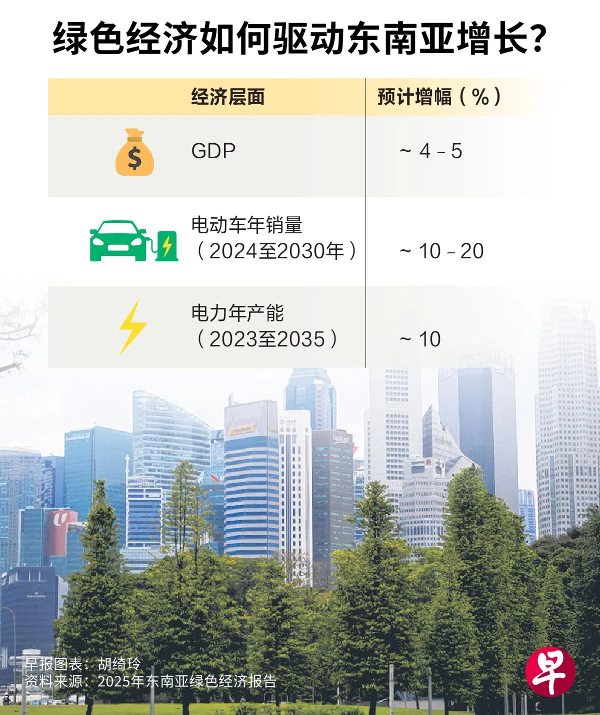 根据最新报告的估算,绿色经济能驱动东南亚经济体每年经济增长4%至5%;六年内电动车的销量逐年递增10%至20%;东南亚12年内电力产能逐年递增约10%,且绿色经济能促进就业和行业转型,同时促进区域能源安全并收获气候益处。