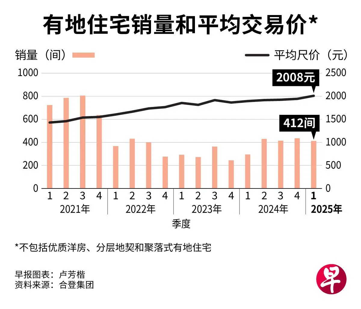 向来价格稳定的本地有地住宅,交易平均尺价首次在今年第一季环比增长3.3%至2008元,是两年多以来的最快增速。