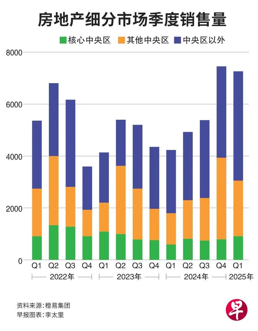 第一季共有192个有地住宅与非有地私宅交易,环比增40.1%,同比增长81.1%;上一季度,核心中央区的销售交易量是自2023年第四季以来最高,当时共有215个单位交易。