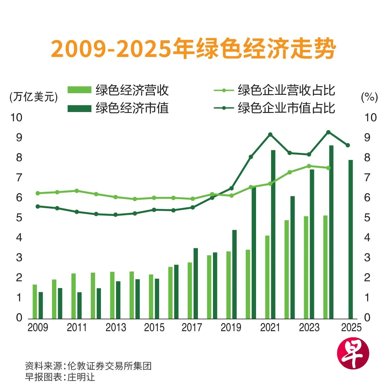 截至2025年4月,全球绿色经济总市值达7.9万亿美元(约10万亿新元),占全球上市股本的8.6%;2024年绿色经济相关产品与服务的营收则突破5.1万亿美元,10年复合年增长率为8%。若将绿色经济视为独立产业,市值仅次于科技、工业与医疗保健,排名全球第四。