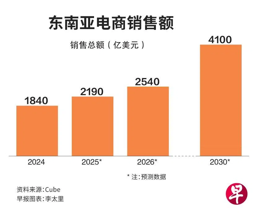 数码支付和物流领域的迅速发展,推动在线购物市场快速扩张。预计到2030年,东南亚电子商务销售额将增长到4100亿美元(约5335亿新元),相比2024年的1840亿美元(约2400亿新元),复合年增长率为14%。