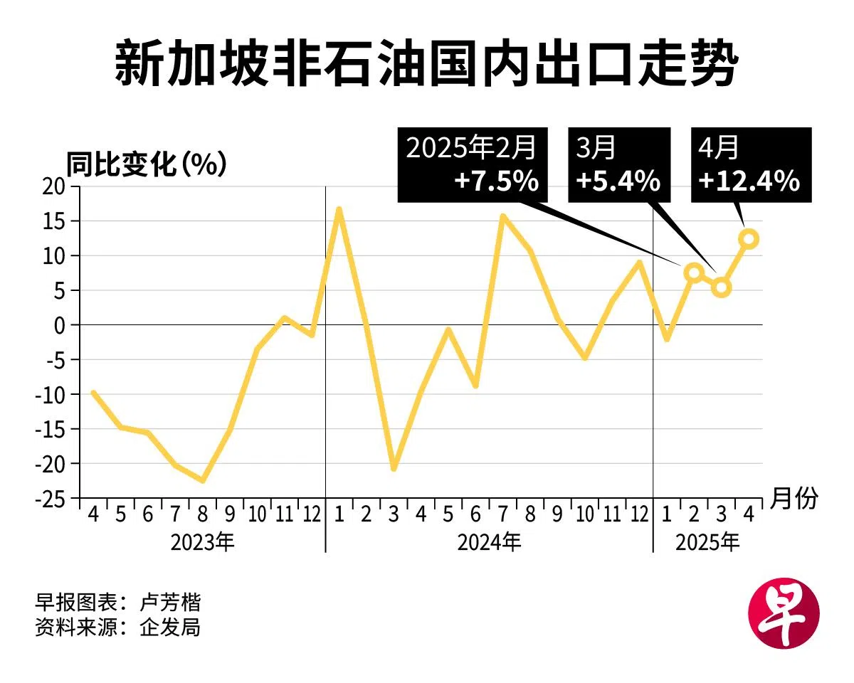 新加坡企业发展局星期五(5月17日)公布最新数据时指出,4月份非石油国内出口同比增长12.4%,而前一个月的增幅是5.4%,电子和非电子领域的出口皆增长。这个增幅远高于彭博社此前调查的4.3%预期。