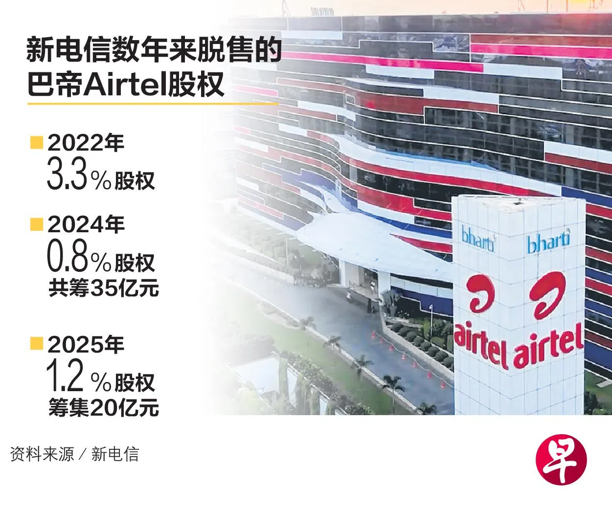 新加坡电信(Singtel)已以20亿元的价格,脱售它在联号公司印度巴帝Airtel(Bharti Airtel)的1.2%股权。