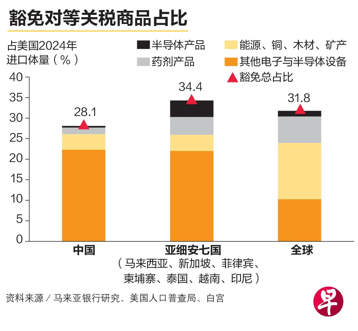 此前,智能手机、电脑、半导体设备等电子产品,均被豁免对等关税,也释放出相同信号。这些商品占美国2024年进口总量的11.8%,对本区域也尤为重要,因为它们占亚细安输美商品26%。