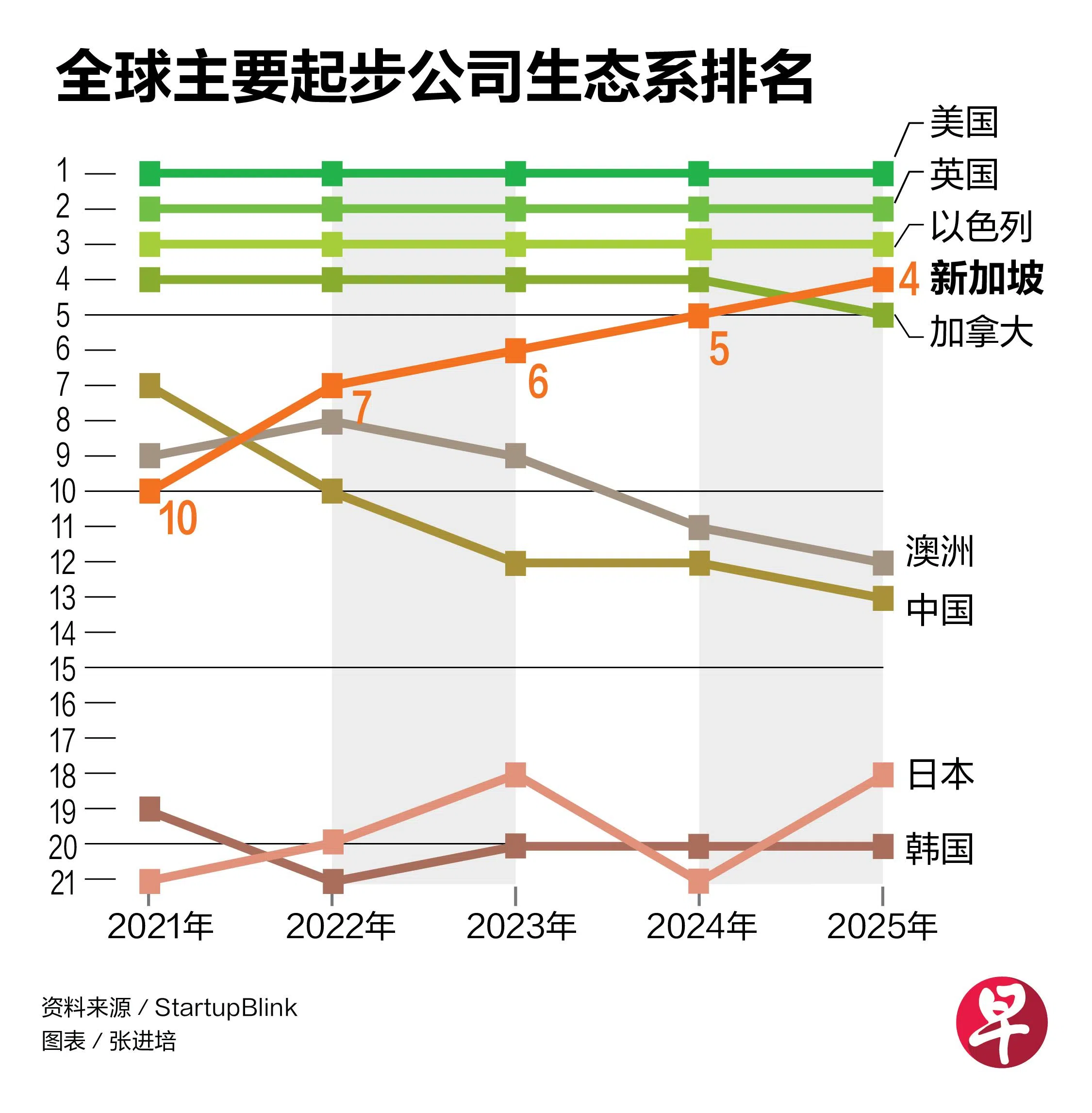 报告指出,在全球20大起步公司生态系统中,新加坡、法国和日本可说长期赢家。“新加坡从2021年的第10大幅攀升至2025年的第四,在前列国家中的跃升幅度最大。法国从第12稳步上升至第八,持续进入前10,而日本则从第 21上升至第18,进入全球前20大。”