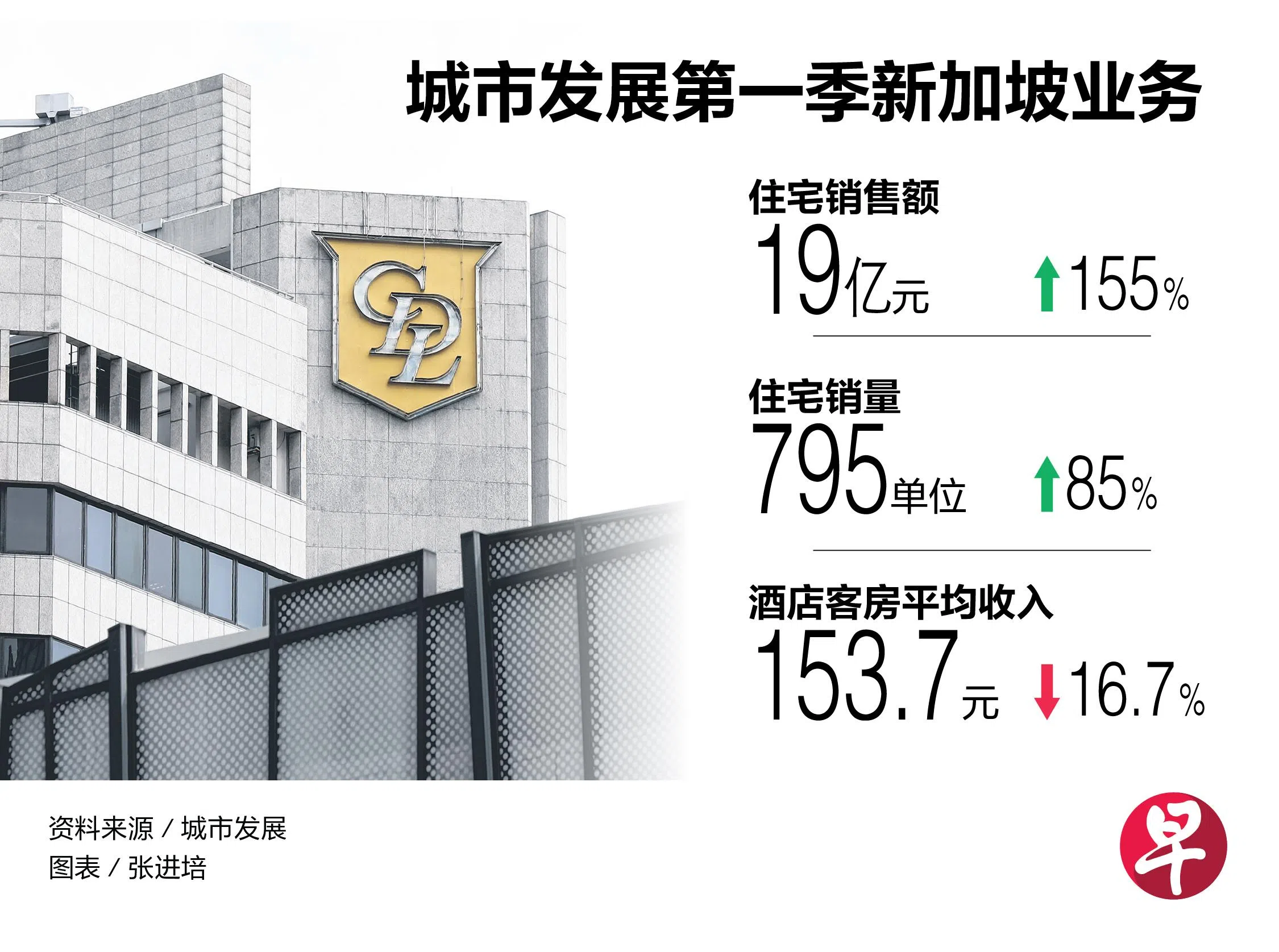 城市发展(CDL)第一季在新加坡的住宅销售额同比飙升155%至19亿元,销量则同比大增85%至795个单位,这主要是受今年初推出的公寓项目艺景峰(The Orie)取得亮眼销售成绩所推动。