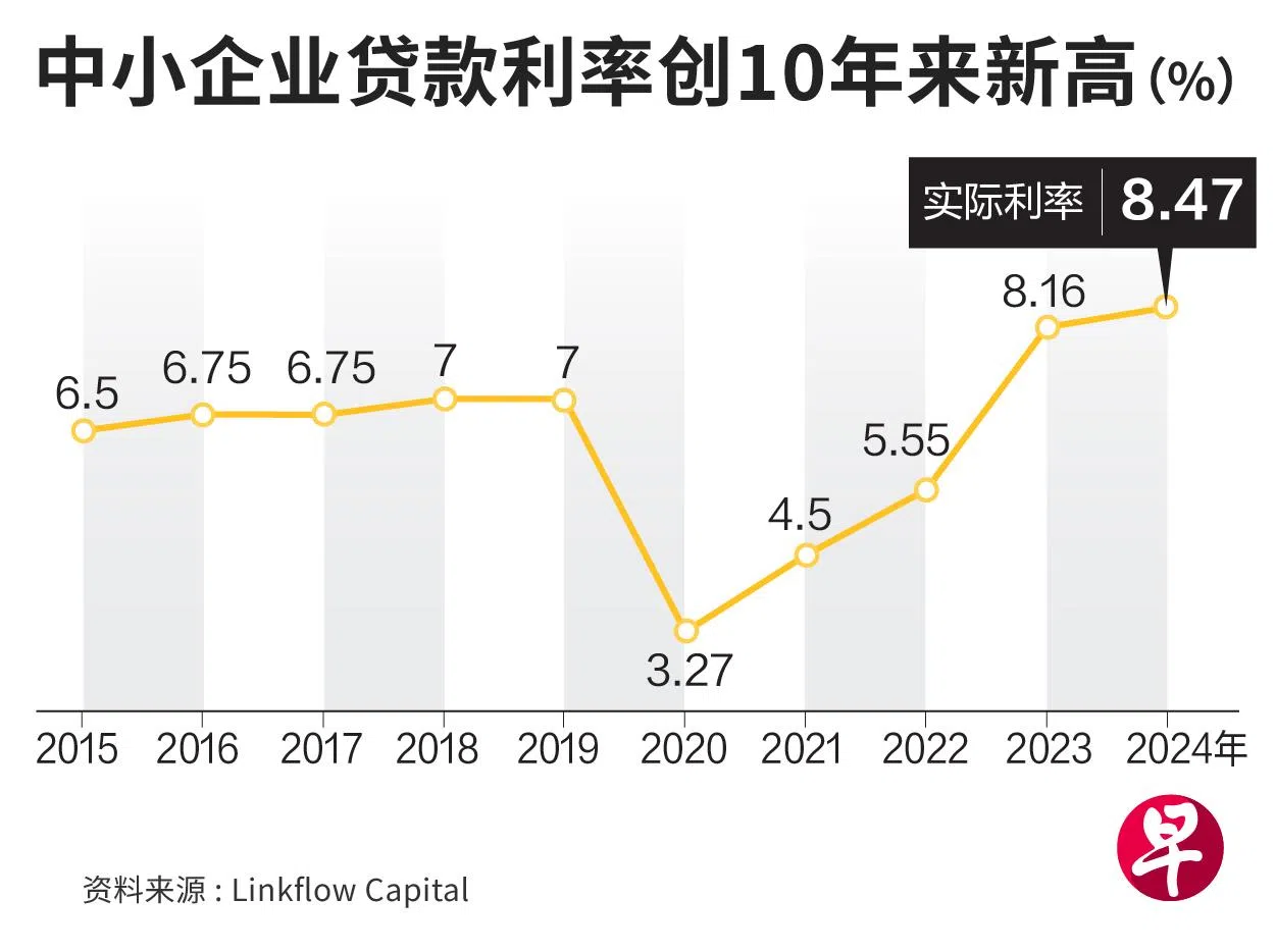 中小企业融资环境持续收紧,不仅借贷成本攀升,借贷审批也更为严苛。根据Linkflow Capital最新调查,本地中小企业2024年贷款平均年利率升至8.47%,创下近年来的高水平;申请并获批超过50万元的贷款个案,更是从2023年的12笔锐减至零,反映出大型融资需求遭遇更大阻力。
