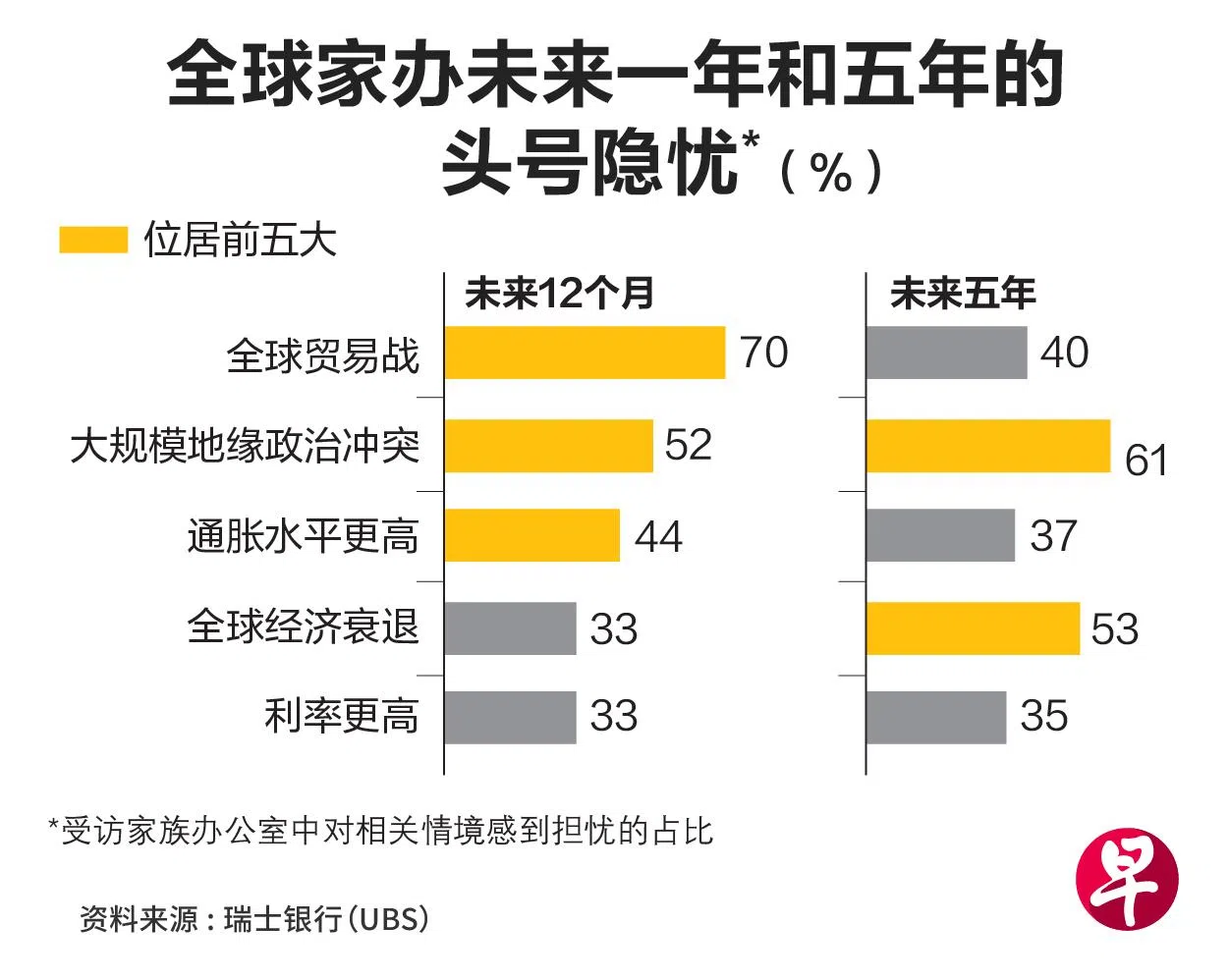但值得注意的是,贸易战已成为家办当下最担忧的风险因素。有高达七成的受访家办认为,全球贸易战是接下来12个月的头号隐忧,而上一年居首的大规模地缘政治冲突在今年退居第二,比率为52%。