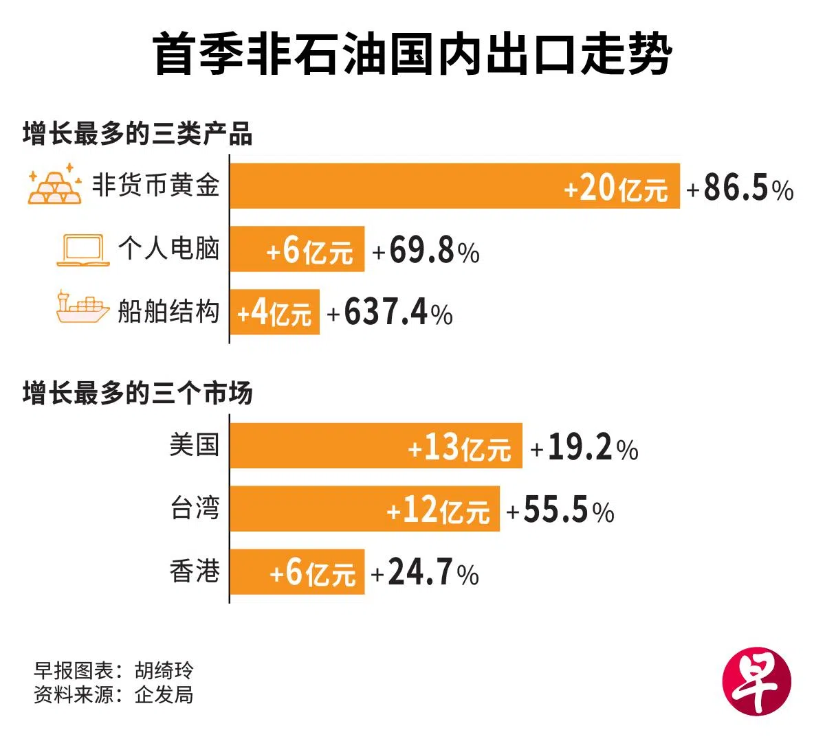 在出口领域方面,非电子产品出口在第一季同比增长1.8%,扭转前一季0.7%的萎缩。增长主要受非货币黄金、船舶结构和测量仪器出口带动,三者分别大幅上扬86.5%、637.4%和11.5%。