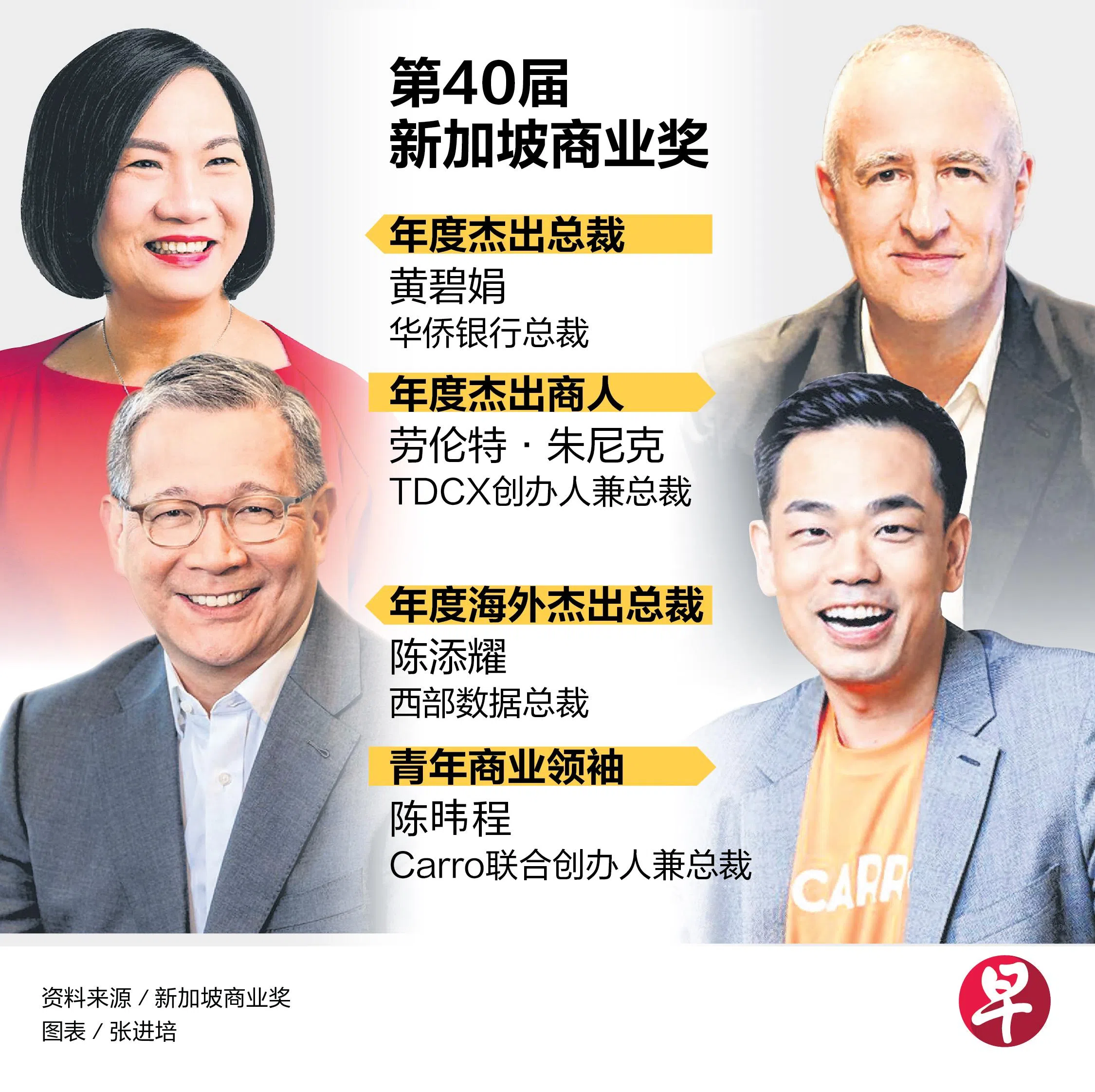 华侨银行总裁黄碧娟带领银行深化对亚细安及大中华区市场的战略布局,同时充分发挥集团在金融服务、财富与资产管理及保险业务之间的协同优势,推动整体业务持续增长。凭借卓越的领导力与成就,她荣获新加坡商业奖(Singapore Business Awards)颁发的“年度杰出总裁奖”,获得高度肯定。